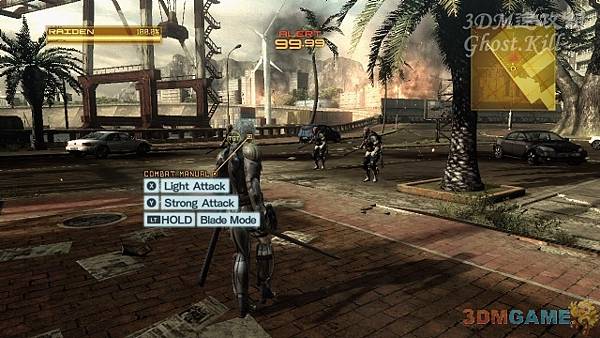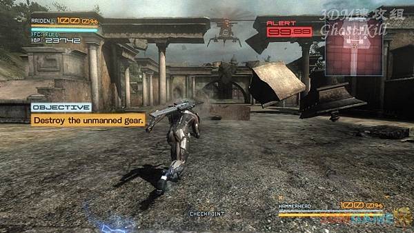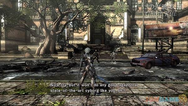 回到大街上,這裡快速沖刺到前邊的橋下,幹掉三個生化兵後砍斷柱子,這樣橋上的機甲會掉下來,輕鬆幹掉。